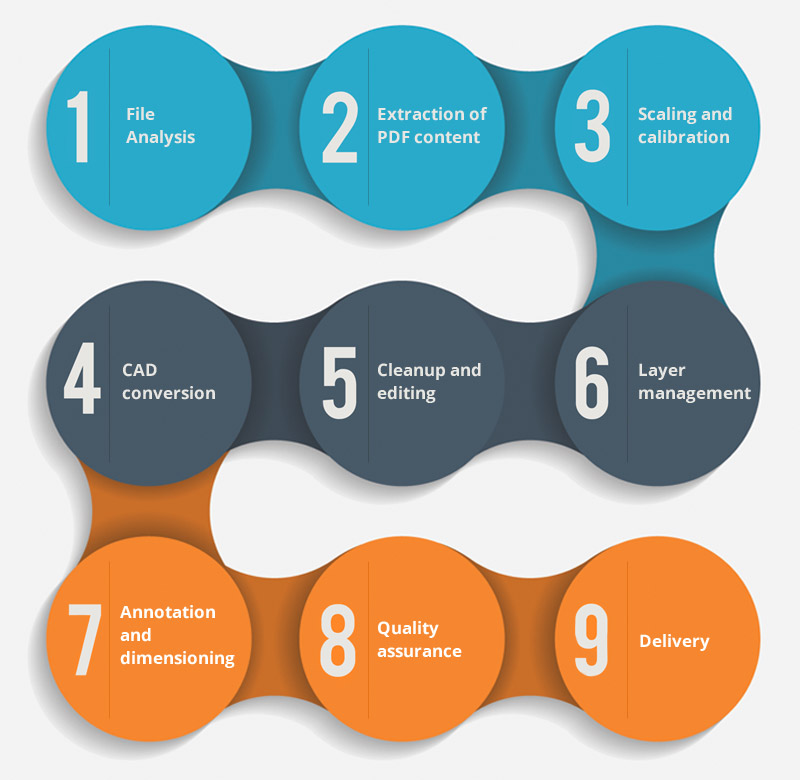 Our experienced team follows a meticulous process, including file analysis, content extraction, scaling, cleanup, layer management, and quality checks, to ensure the accuracy and precision of the converted CAD drawings. We have stringent quality control measures in place to deliver reliable results.